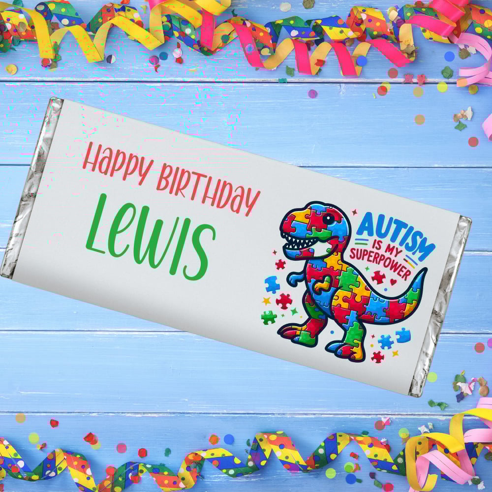 This delicious milk or white chocolate bar is specially designed with kids or adults on the autism spectrum in mind. Featuring a colourful dinosaur, clear fonts, and sensory-friendly colours, it avoids overwhelming patterns while still feeling festive and joyful.